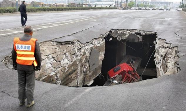Σύμφωνα με ρεπορτάζ της daily mail το φορτηγό προκάλεσε την τεράστια τρύπα στο δρόμο της πόλης Changchun της Κίνας. Ακόμα βέβαια δεν μπορούν να εξηγήσουν πως έγινε το ατύχημα αλλά πιστεύουν ότι η κακή ποιότητα του δρόμου σε συνδυασμό με το υπερφορτωμένο φορτηγό προκάλεσαν τη ζημιά.
