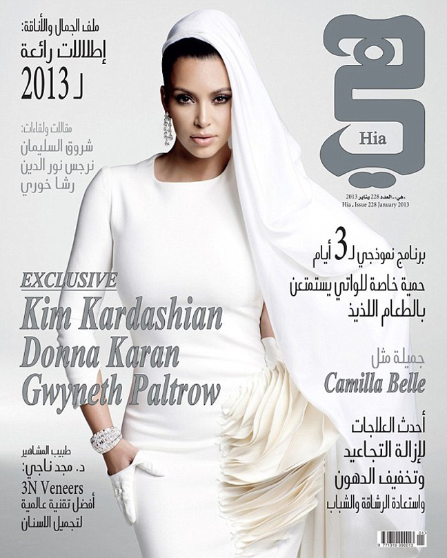 Φωτιές στον αραβικό κόσμο «άναψε» η Kim Kardashian αφού αποφάσισε να φωτογραφηθεί για λογαριασμό του αραβικού γυναικείου περιοδικού, Hia καλύπτοντας τα στήθη της με μία μπούργκα. Το στήθος της καλύπτεται από κομμάτια ριχτού υφάσματος