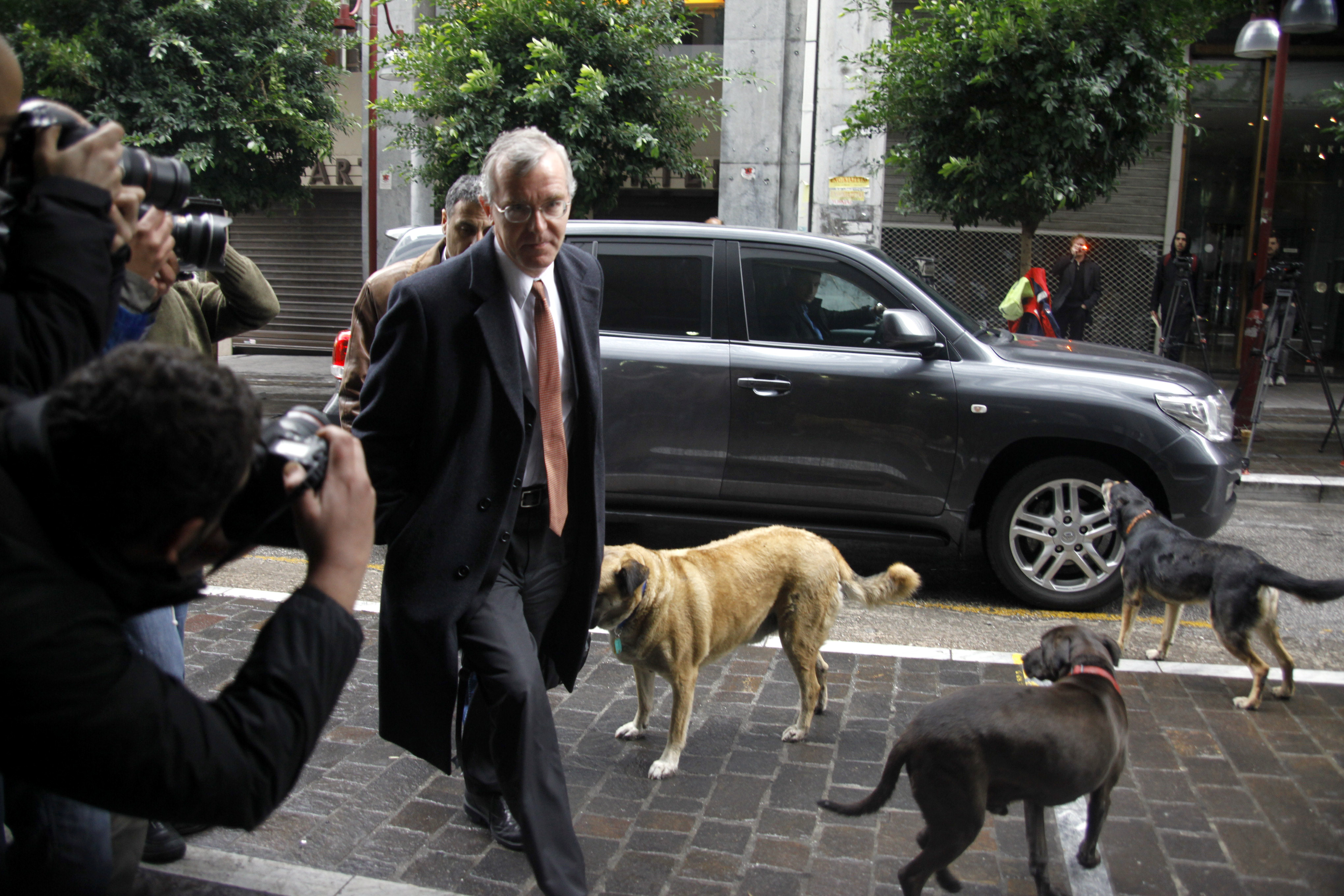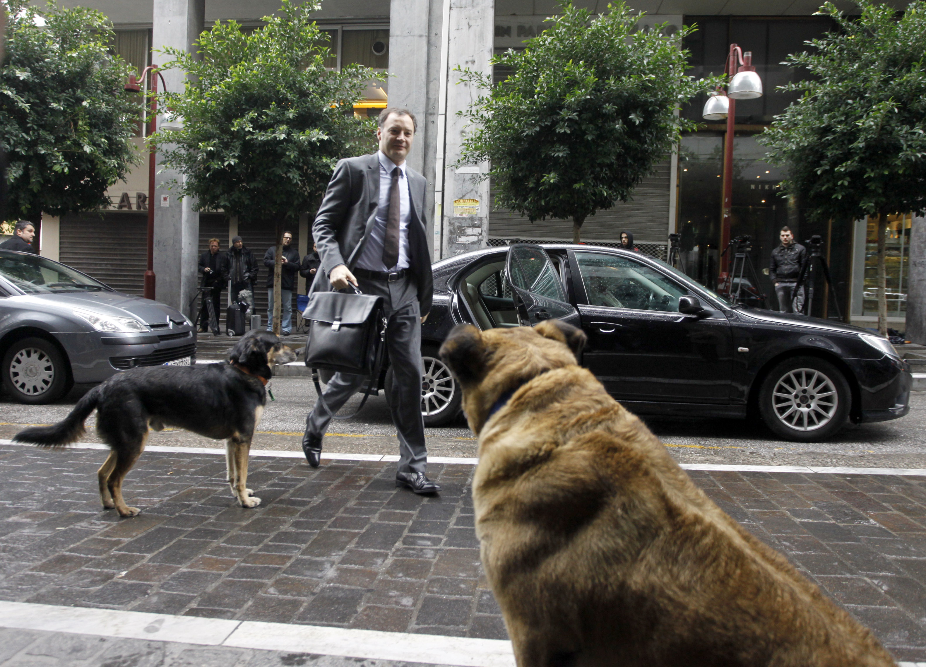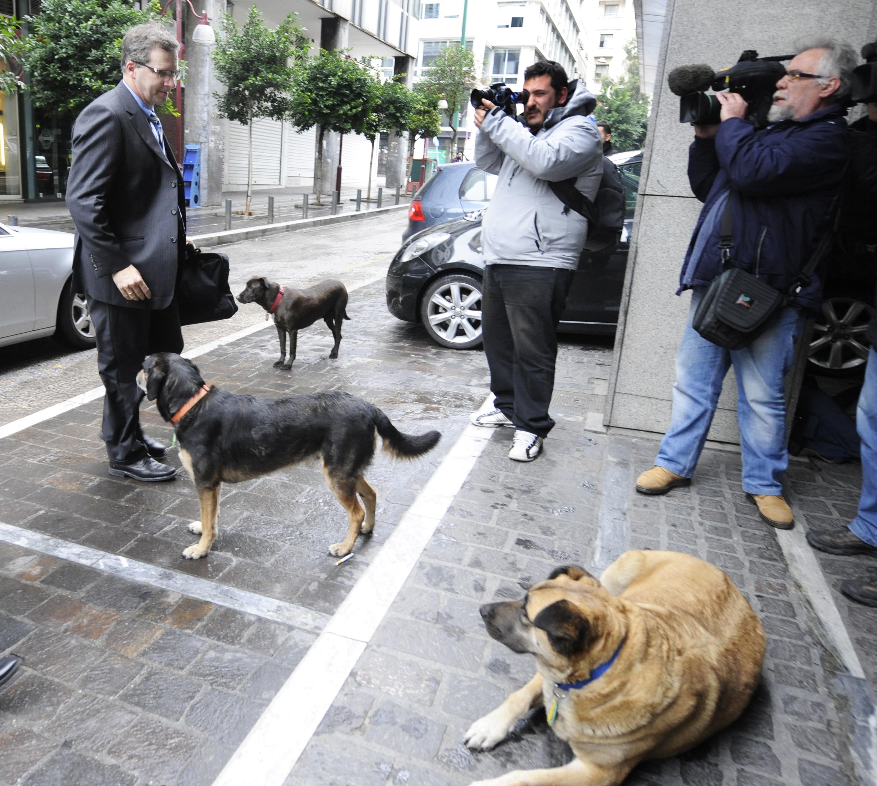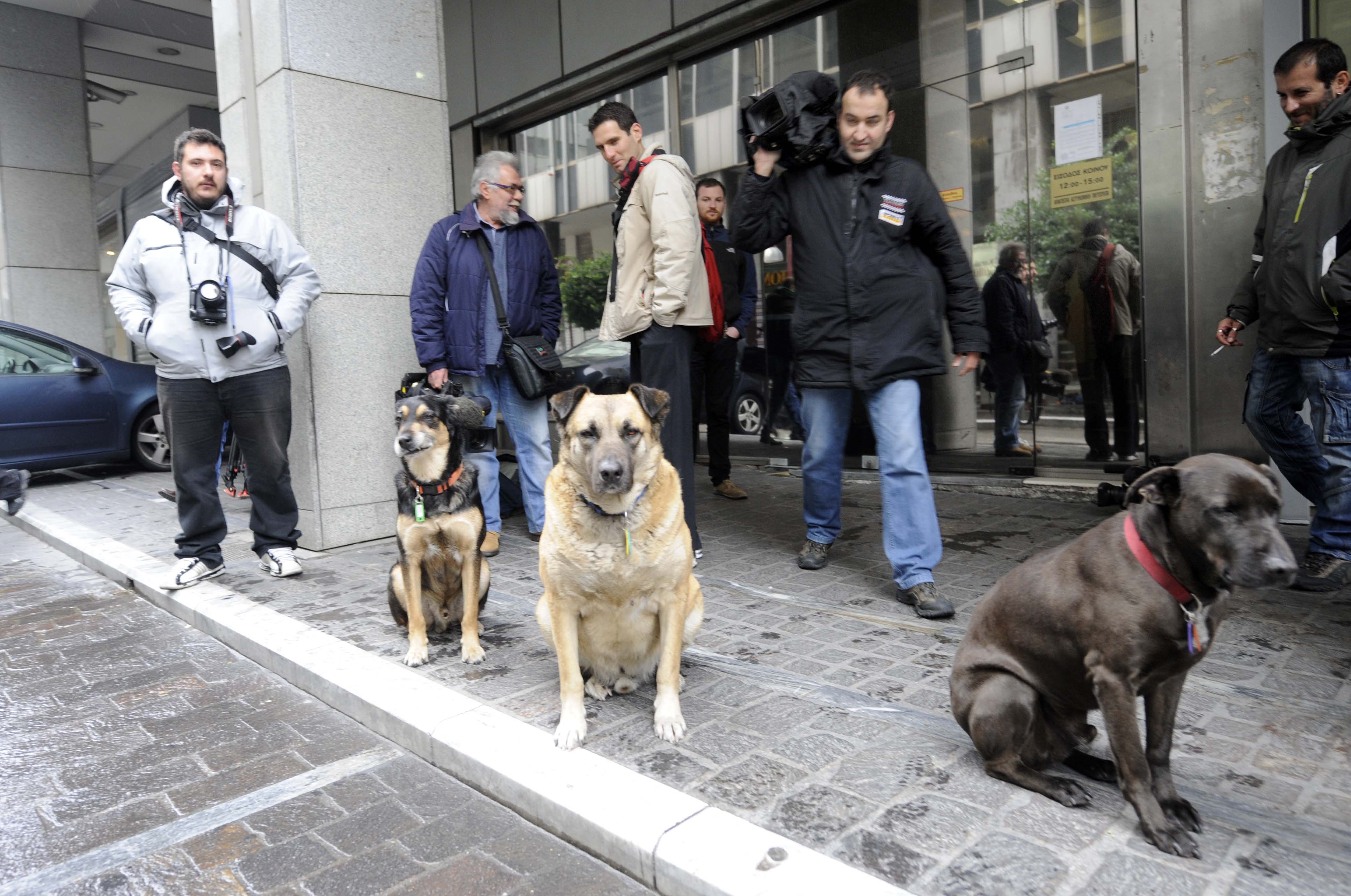 Δεν μιλάμε ασφαλώς για τους υπαλλήλους του υπουργείου Οικονομικών αλλά για τους σκύλους που είχαν στηθεί μπροστά στην είσοδο για να τους προϋπαντήσουν.