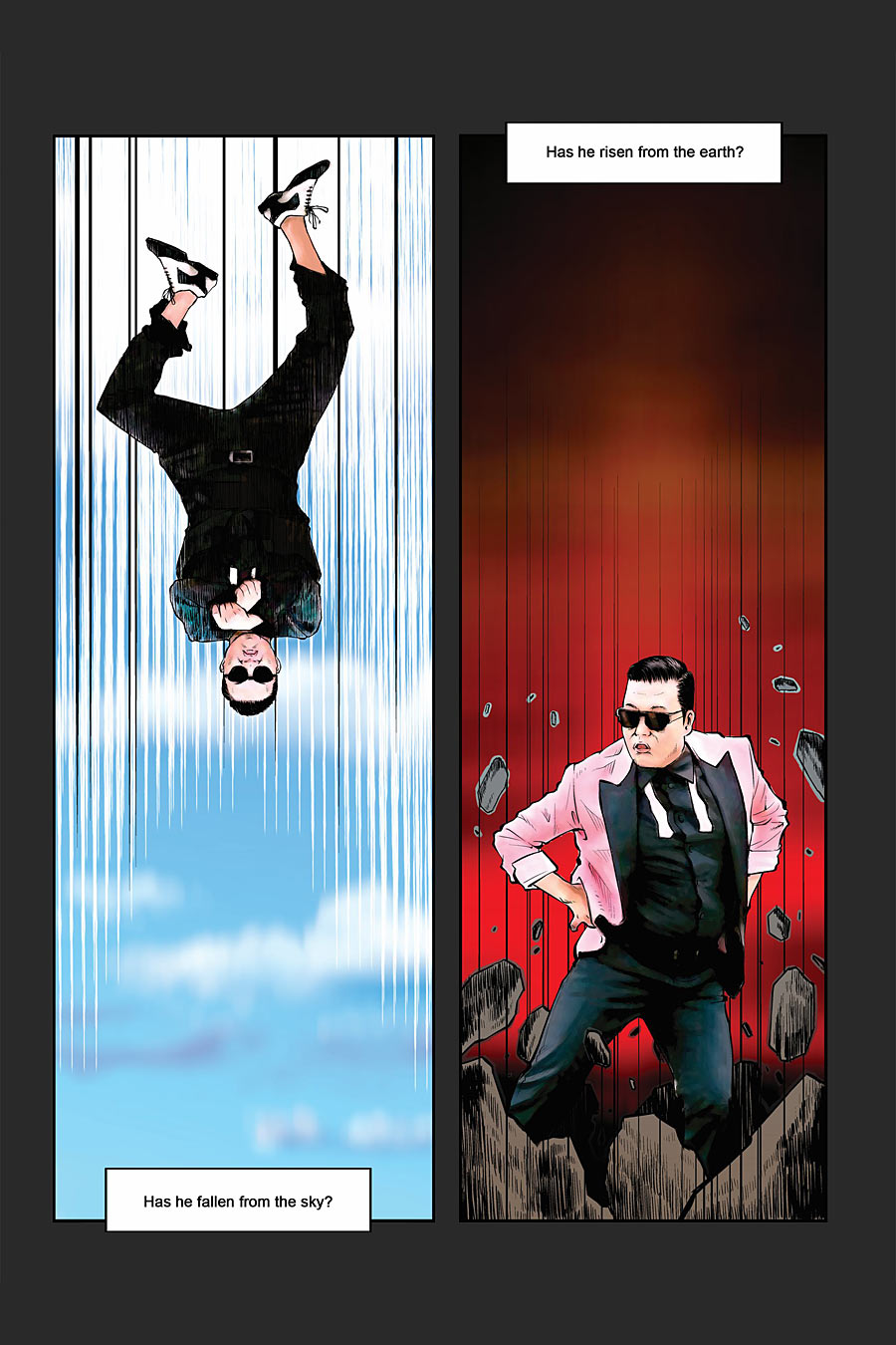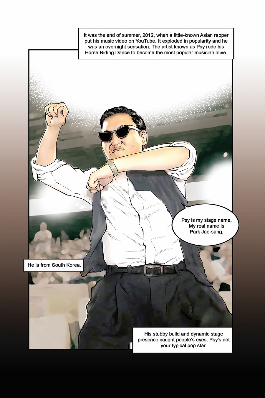 «Ήταν το τέλος του καλοκαιριού του 2012, όταν ένας ελάχιστα γνωστός ράπερ από την Ασία ανεβάζει το βιντεοκλιπ του στο YouTube και απέκτησε τεράστια φήμη» αναφέρεται στο κόμικ