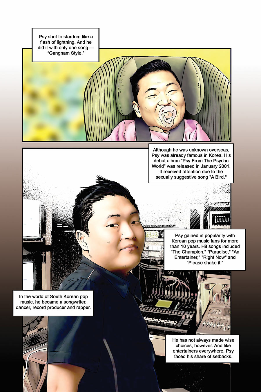 Σύμφωνα με το Ρόιτερς, το κόμικ έχει τίτλο «Fame: Psy» και παρουσιάζει τις δοκιμασίες και τις ταλαιπωρίες του Νοτιοκορεάτη σταρ στο δρόμο προς το διεθνές καλλιτεχνικό στερέωμα και την παγκόσμια δόξα