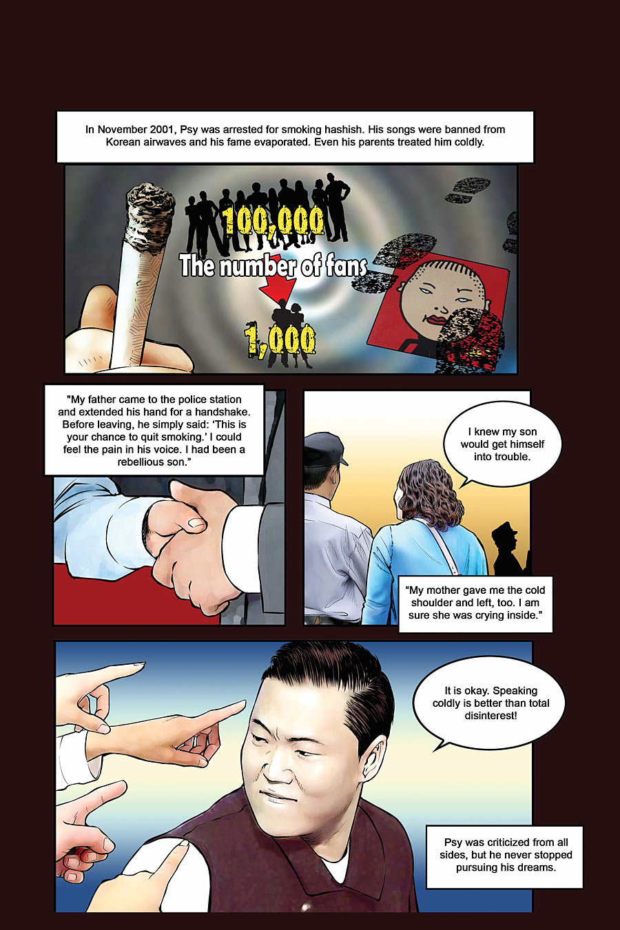 Ωστόσο δεν είναι όλα ιδανικά στη ζωή του Psy: Το κομικ αναφέρει επίσης την σύλληψη του ραπερ το 2002 για κατοχή μαριχουάνας που τον έκανε να χάσει την κηδεία του παππού του.